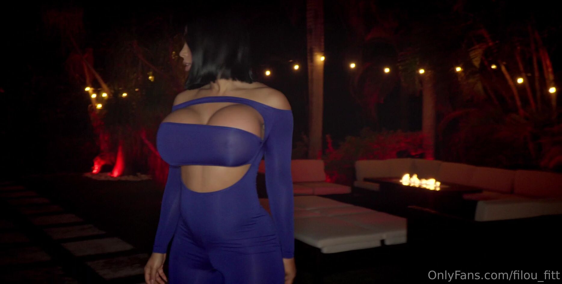 Beautiful girl walks through a garden of a house at night wearing a sexy tights and starts to teach and touch herself and gets naked and appears a guy and takes off her panties and have sex